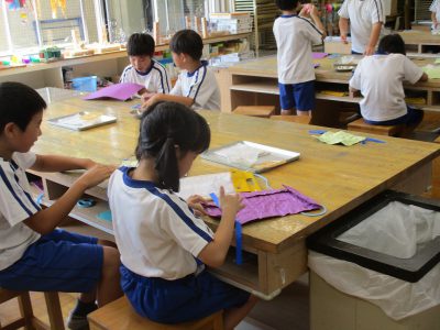 図工の学習は、前回から引き続いて「心を込めてプレゼント~巾着作り~」です。