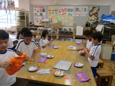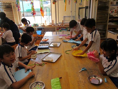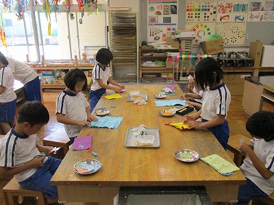 教室と違う図工チームで、ボンドをいっしょに使ったりして作業を進めます。