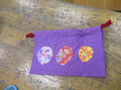 巾着の形ができ上がり、早い人は和風な飾りをつけるところまで進めました。