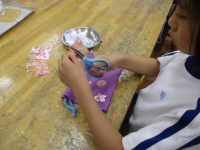 丁寧にボンドをつけて、ひもをつける作業ができました。