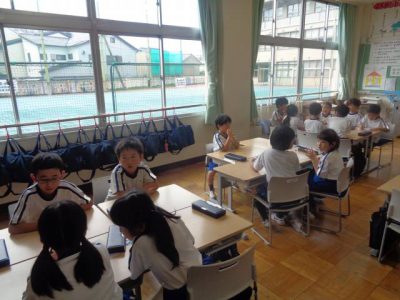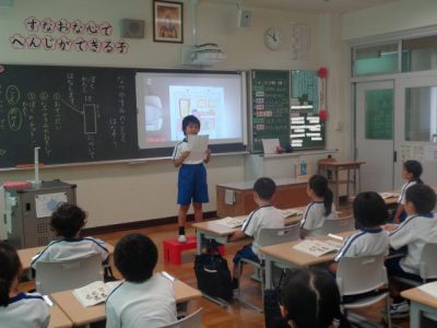 「夏休みのことを話そう」というテーマで、みんなの前に立ってスピーチをしました。