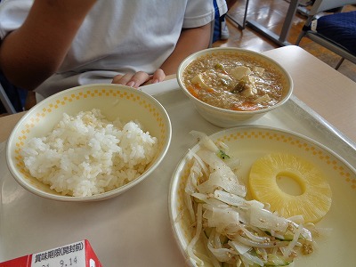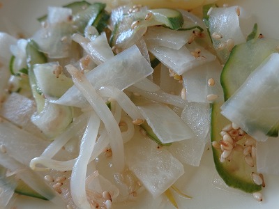 ナムルは、野菜にごま油や食塩を混ぜて味つけをする韓国の料理です。給食には出汁も少し混ぜたので、塩味をおさえて作れました。