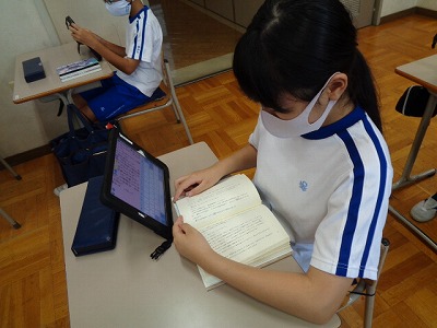 感想文を書くために選んだ本とタブレットを横に並べて、真剣に書き進める6年生です。