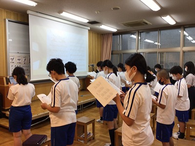 どの学年の教科書にも掲載されている国歌「君が代」です。前奏を耳にすると「あっ、知ってる!」という反応を示していました。「いつまでも平和な世の中が続きますように」という願いを込めた歌詞の意味を読み合いました。