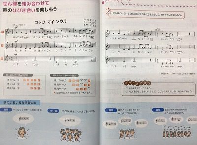 後半は、「♪ロックマイソウル」の歌を紹介しました。この曲を使って、「斉唱」や「重唱」「合唱」の学習をします。ひとフレーズが、大変短くて歌いやすいのですが、3パターンのメロディを歌いこなし、他のパートにつられないで歌うことは至難の業!?のように予想しています。