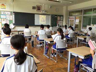 今、台風9号が九州に近づいています。沖縄では激しい風雨のニュースを見た人が多いことでしょう。また、10号が南の海に発生しました。台風が近づいてきた時、建物の中にいて自分の身を守るお話を聞き、自分にできることは何かを考えました。