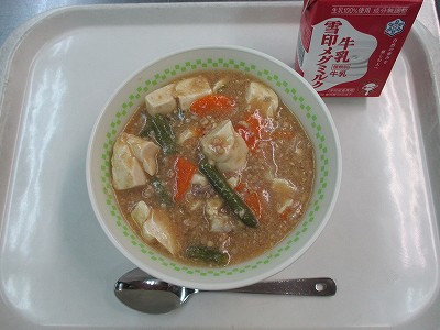 豆腐はしっかり蒸して、水分を飛ばし下準備をしておきます。まぜ合わせたときに、豆腐から水分が出にくくなるので、水っぽくなるのを防げます。本校では、豚ひき肉に加えて、大豆をミクサーで砕いたものも入れており、栄養満点です。