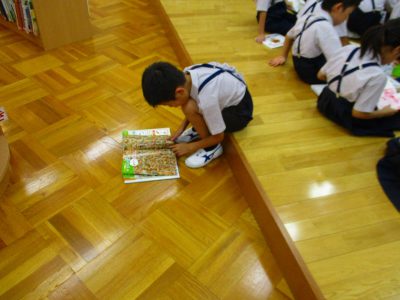 「読み聞かせコーナー」で場所をキープしながら一冊の本を見合っている子達……