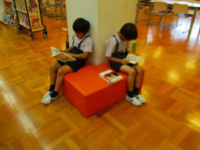 カラーソファーに寄り添って読む子達、背もたれを利用する子、一人の空間を好む子、
