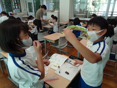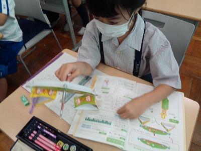 お道具袋から色々なものを取り出したり、一番○○なものは何だろう?と考えたりするなど、重さ比べの活動に意欲的な3年生です。