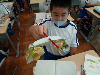 今日は、教科書P157の「てんびん」を組み立てて、重さ比べの活動です。