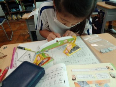 重さの表し方(グラム)を確認し、鉛筆や定規、消しゴム等の文房具の重さが一円玉(1枚1g)何枚分になるかを調べました。