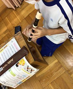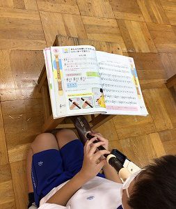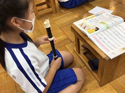 「ソラソラソ・」や「シラシシシ・」など、教師の即興音楽に対応して、リコーダーの運指練習に集中しました。