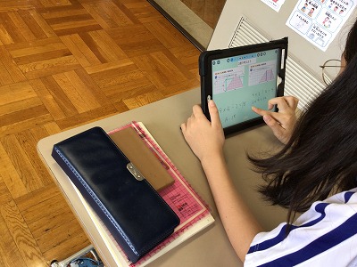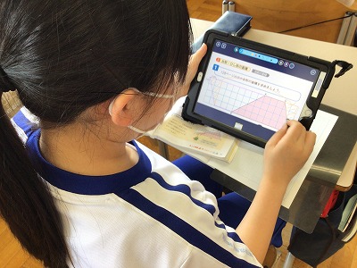 タブレットを通して、お互いの考えが共有できます。一つの解き方にとどまらず、いろいろな求め方を追求しようと、多彩な意見が登場しました。