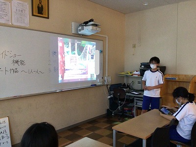下学年もしっかりと付いてきています。「ワンちゃん消防設備」と題して、廊下に設置された防火バケツや消化器、消火栓などをカメラに収め、素敵な音楽と共に、“消防ショー”を披露していました。