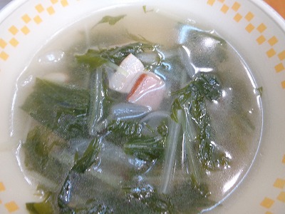 じゃがいものスープは玉ねぎ、水菜、ベーコンを合わせています。じゃがいもはよく煮ると、崩れて形がなくなってしまうので、いったん蒸して、あまり煮なくてもよいように工夫しています。