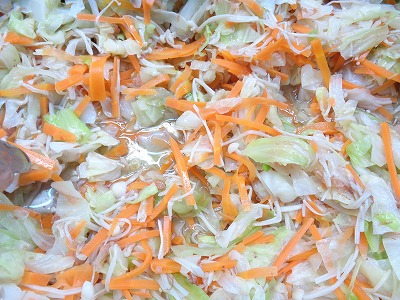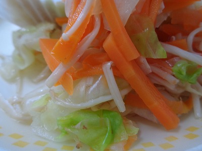 キャベツのおかかあえは、キャベツ・えのき・人参を合わせた和えものです。