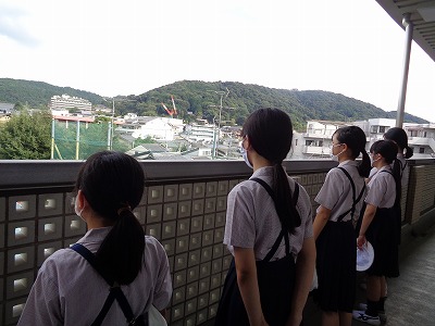清少納言がどこを見ながら(想像しながら)書いたのか、おそらく東山連峰です。まさに、5,6年生教室・バルコニーから見える光景です。山ぎわ(山に接している)空が少し明るくなり、紫がかった細長い雲の様子に感銘を受けています。
