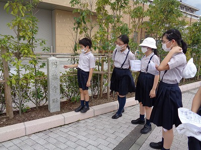 なんと明治28年! 近代に入ってからの建立にびっくりしたメンバー。建立に至ったいきさつを、先生から聞きました。昨年、琵琶湖疏水について学習した5年生の目が輝きました。疏水と当時の内国博覧会、そして、平安神宮の関係を想像しながら 先を歩きました。