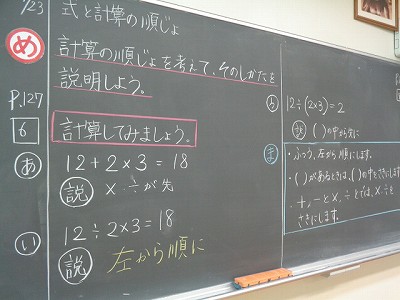 算数は「式と計算の順序」について学習をしています。今日の学習目標は「計算の順序を考えて、その仕方を説明しよう」です。今日は、計算式の順番を説明する事を中心に学習を進めました。ふつうの式は左から順に計算をすることや、()の中を先に計算すること、+や-より、×や÷を先に計算するなどのポイントを抑えます。