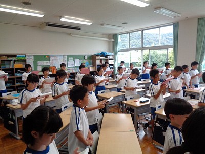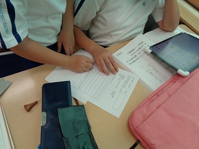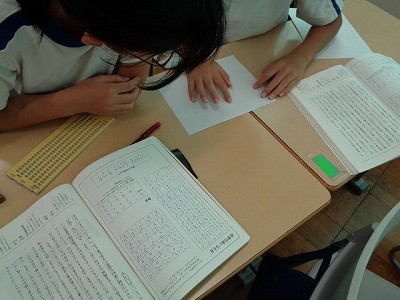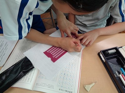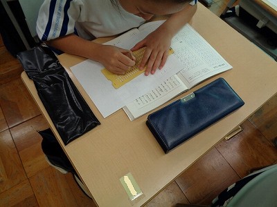 国語授業では、簡易点字機を使って、自己紹介カードをつくりました。先週、練習して、今日は本番! …ですが、難しい…。教科書の点字表をみながら、点字を打つのですが、用紙の裏側から打つので、左右逆に打たなければなりません。これが難しい!「わたしは○○です。よろしくね。」だけなのですが…、皆、真剣に、悪戦苦闘しました。街中で見かける点字への関心が深まり、点字がすらすらと読めるようになったら…格好いいですね!期待しています。