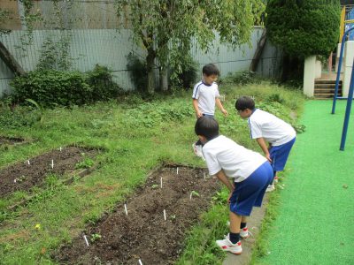 先週、6年生と種まきをした畑を見ると、大根の芽が出ていました。