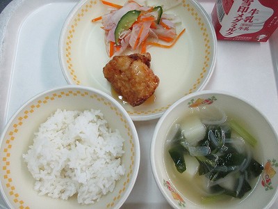 じゃがいも、玉ねぎ、小松菜のスープです。じゃがいもに豊富なビタミンCは水に溶けやすい性質を持ちますが、スープにして食べることで溶け出た栄養分もしっかり食べられますね。また、小松菜は、カルシウムなどのミネラル分が豊富です。カルシウムは骨や歯をつよくするだけでなく、脳の活性化に役立ったり筋肉の動きをなめらかにする手助けをしてくれる栄養素です。