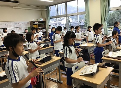 さあ、いよいよ歌とリコーダーを合わせる“合唱奏”の時間がきました。歌っているだけでも、3拍子の拍にのって体が自然に動いてくるのですが、リコーダー奏が加わると、さらに表現が豊かに完成されていくように感じました。
