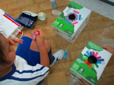 この後、カラーのビニールテープを使って、カラフルロケット作りに集中していました。