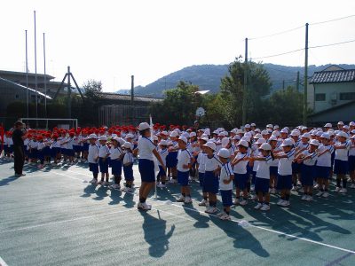 [朝の準備体操の後、かけ足で集合!]