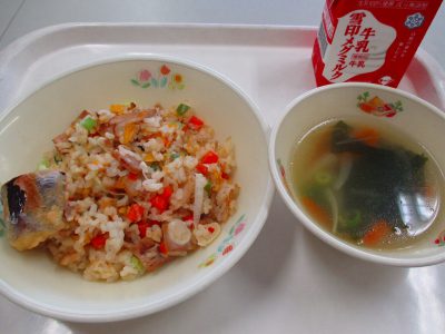今日の献立は「五目チャーハン、なすの天ぷら、わかめのスープ」です。