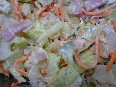 れんこんが主役のサラダです。れんこんは下味をつけています。シャキシャキとした食感がアクセントになります。