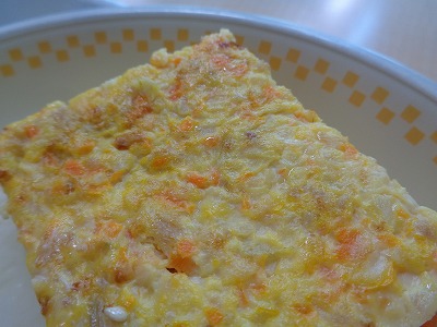 千種焼は、玉ねぎ、人参、鶏ひき肉をといた卵に混ぜて焼きます。味付けには、しょうゆや出汁を使うので、焼いた時に良い色の焦げ目がつきます。出汁がたっぷり入っているので、しっとりとした焼き上がりです。白いご飯によく合います。