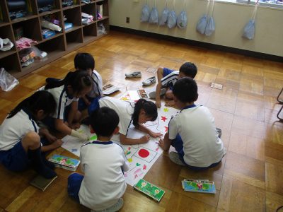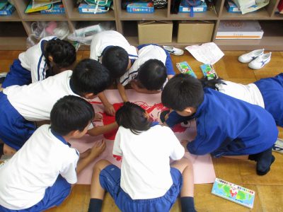 休み時間には、赤組・白組のキャラクターポスター作りも、少しずつ仕上がってきました。