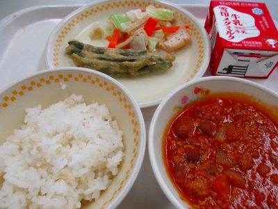今日の献立は「チリコンカーン、三度豆の天ぷら、キャベツのおひたし」でした。