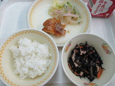 ひじき、人参、こんにゃく、油揚を使ったひじきの煮物でした。ひじきには鉄分などのミネラルのほかに、カルシウムや食物宇繊維がたっぷり含まれています。腸をきれいにしてくれる食物繊維は、便秘を防いでおなかの調子を整える働きがあります。野菜や海藻類に多く含まれているので積極的に食べるようにしましょう。