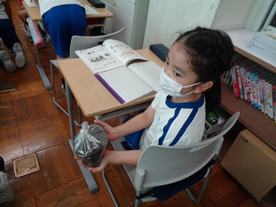 まずは「1kgの重さ」の感覚を掴み、身の回りから1kgぐらいのものを見つける活動です。