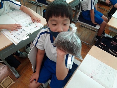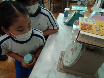 学習の後半は、はかりを使い、いろいろなものの重さを予想して調べました。