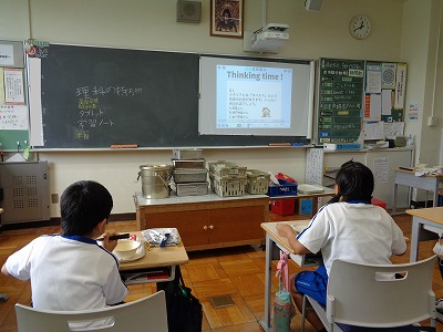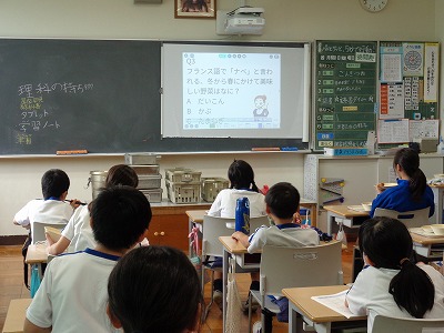 給食時間、食生活委員会メンバーがタブレットを活用して「たべものクイズ」を行いました。