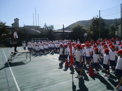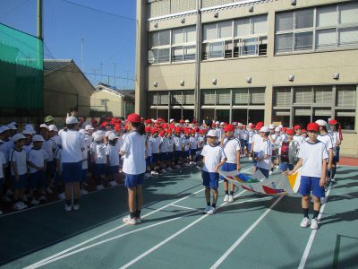 終わりに応援練習と、児童会が考えた競技「ミュージック・チャンス玉入れ」をしました。