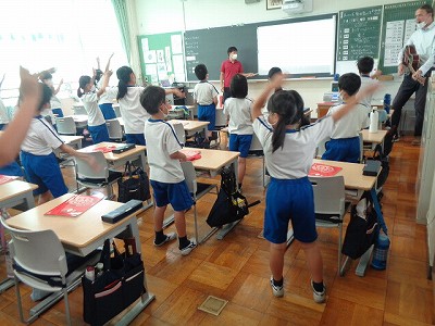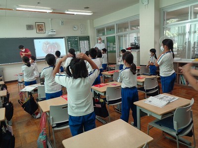 体をいっぱいに動かしながら、「パプリカ」や「大きな栗の木の下で」を歌いました。3年生の意欲あふれる英語の学習です!