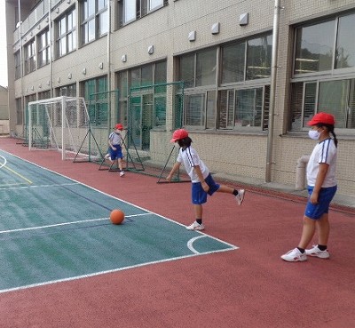 体育は、今日もラジオ体操からスタートです。すっかり流れに合わせて、向きに気をつけて動けるようになりました。エイサーは、基本の動きを確認して、さらに動きが難しい所の確認をしました。全員で動きがそろうことが多くなってきました。一つ一つの動きの精度も今後磨いていきたいです。最後に、運動場に出てキックベースの練習です。チーム毎に、蹴ってから1塁へ走る練習をしました。