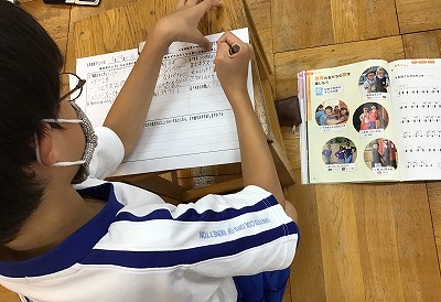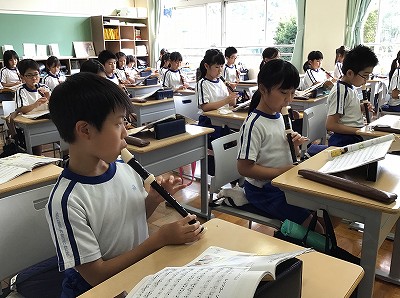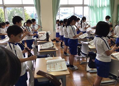 教室に戻って、リコーダーの学習をしました。「♪レッツゴーソーレ」の、ゆっくり・ふつう・速いの3通りのヴァージョンにチャレンジし、息づかいと指使いのコラボに慣れる練習を行いました。