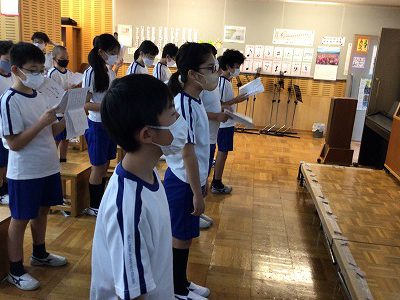 実は、この全体の歌の形を「三部合唱」と呼びます。6年生の皆さんとは、このほか「独唱」「斉唱」「重唱」などと、組み合わせの形に変化を付けて歌唱することを楽しみたいと思っています。