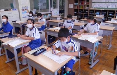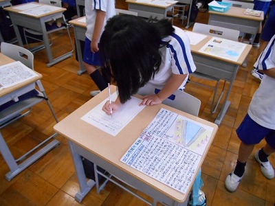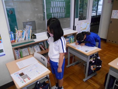 2時間目の社会は、夏休みに取り組んだ「私たちのくらしと水新聞」の交流会を行いました。それぞれの作品を見ながら、コメントを記入していきます。みんなそれぞれ工夫のつまった力作ばかり!カラフルなコンテストの結果が楽しみです!
