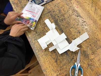 仕上がった子から、一枚の画用紙を切り離さないように気をつけながら、切って・折ってを繰り返し、不思議な画用紙の世界「パラレルワールド」をつくりました。