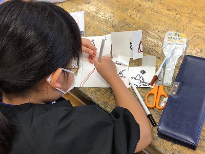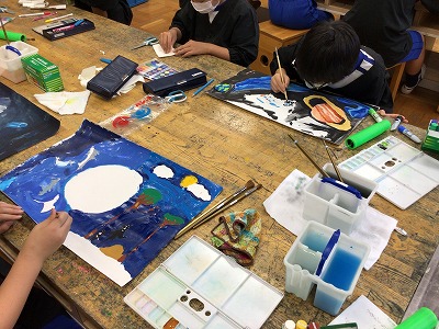 今日の図画工作は「お話を絵にする」の仕上げからスタートしました。