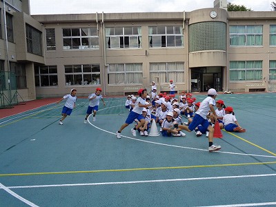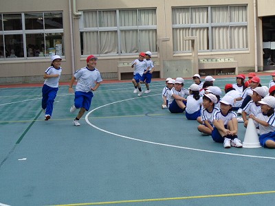 団体競技「台風の目」、徒競走は、練習といえど、もちろん本気モードでの練習です。先週の団体競技練習では、赤が勝ちましたが、今日は白が勝ちました!「油断禁物」です。声を掛け合い、油断せずに協力することが、この競技の勝利のポイントです。さて、本番はどちらが勝つのでしょうか?