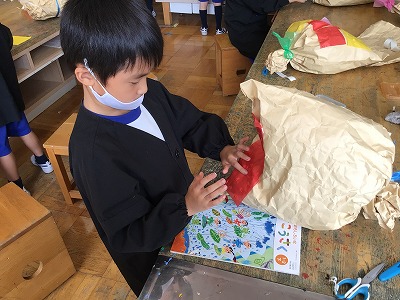 「どんなものをつくろうかな?」とお花紙や画用紙をつけてみたり、クラフト紙を結んでみたりしました。