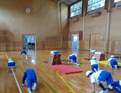 本日も「とびばこ」の学習を行いました。自分の飛べない段に、どんどんチャレンジをしていきます。まずは、かえるとびでウォーミングアップです。おしりをあげて床を蹴ることや、手のひらをしっかり着くこと、足を前にもってくることなどを意識しました。